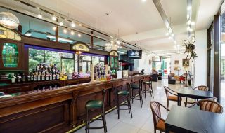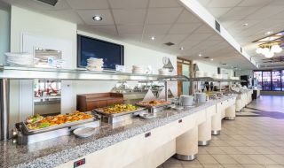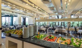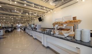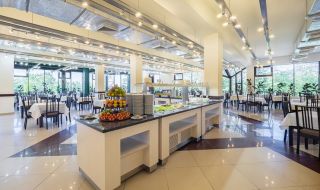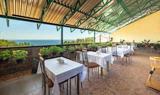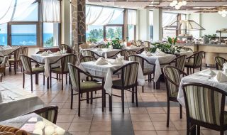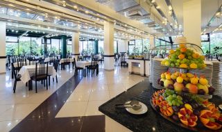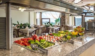 Трёхразовое питание постояльцев по системе «шведский стол» производится в обеденном зале пансионата. Кроме этого, в здравнице работают бары «Зеркальный», «У бильярдной».